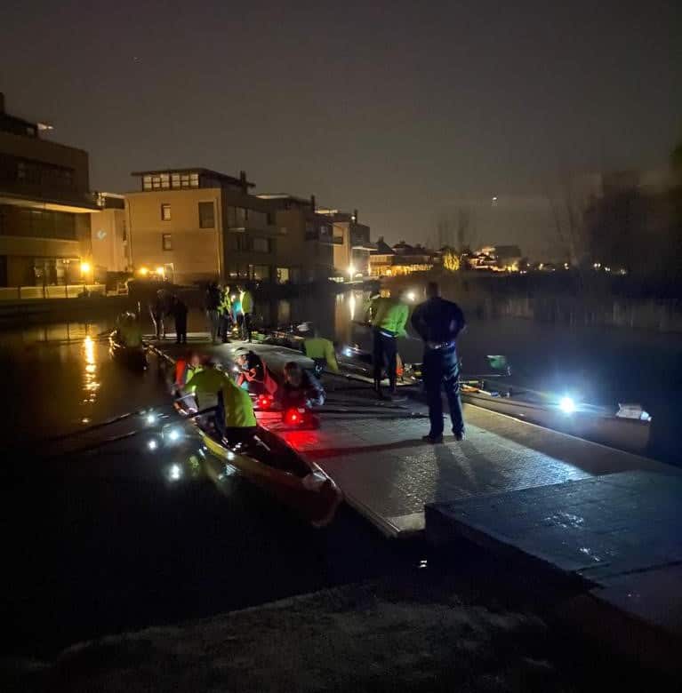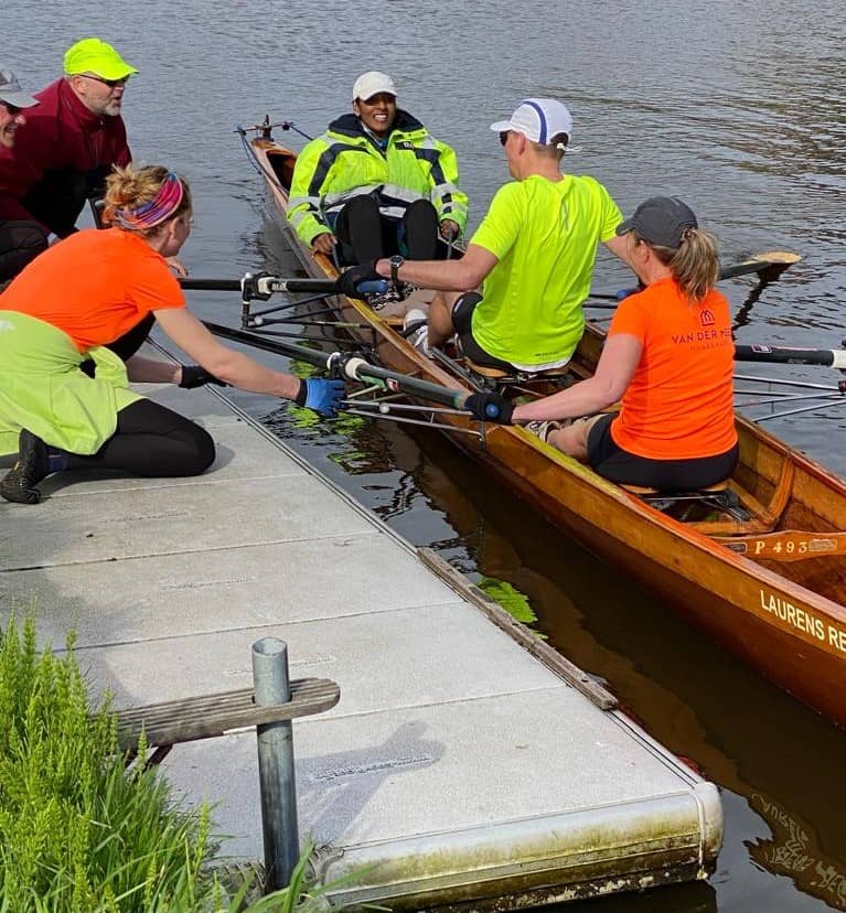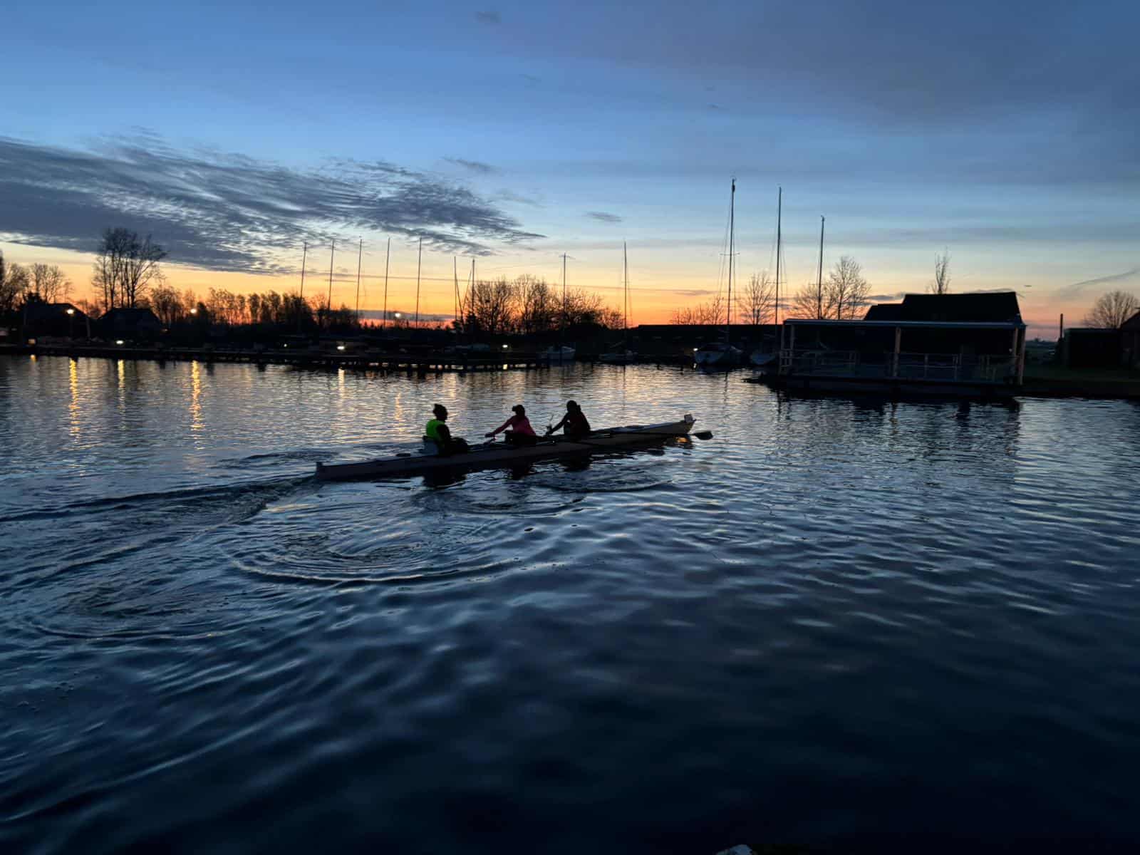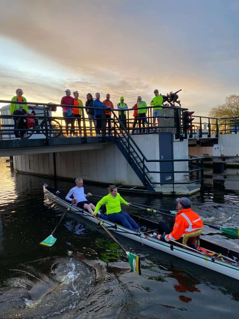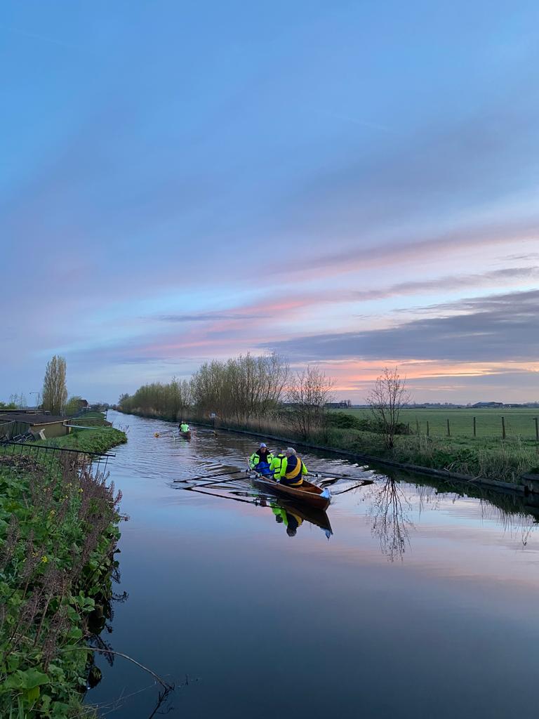 Het avontuur begon weer heel vroeg. Om 5 uur ’s morgens verzamelen in de loods voor de laatste check van de bootuitrusting en de briefing. Daarna de boten in alle vroegte te water laten en rond 05.30 startten de 7 C2x+ boten aan de 90 km lange tocht door de drie provinciën: Noord- en Zuid-Holland en Utrecht.