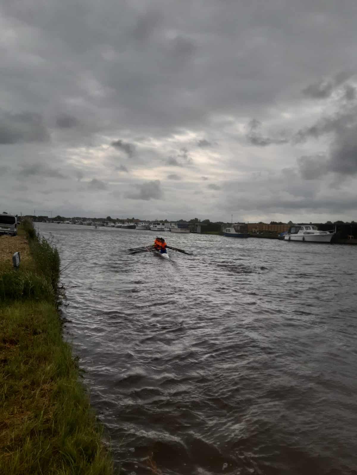 Altijd nerveus voor een wedstrijd. Spanning valt weg na de start. Zijwind vanaf het Joppe geeft forse golven op de Zijl. Zo intens blij dat ik in een vier zit en niet in een skiff! Bij de Tuinderpolder liggen we iets te lang iets te evenwijdig aan de golven. De boot slaat vol. Twee roeien en twee hozen behoudt ons voor zwemmen. Bij het opgaan van de Ringvaart breekt eerst de rechterschoen los van het voetenboord en bij het ringvaartaquaduct de andere ook. De door Elies gebrachte Achterhavenschoenen passen niet op de plaat. Uitstappen en naar de werkbank van Iris terwijl de Wijnhaven op drie mankracht voor de wind en met roer boven water probeerde niet te veel tijd te verliezen. 20 km verder, ter hoogte van de Nieuwe Meer was de boot en bemanning weer compleet voor de aanstaande tegenwind. Weer heftige golven bij de Molenplas.