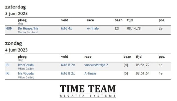 Zondag kwam Milou opnieuw in actie. Toen roeide ze samen met haar vaste roeimaatje Emma Wissing van R.V. Gouda in de klasse M16 B 2x. Een zenuwslopende race, want de boot van Milou en Emma lag tot de laatste 500 meter vlak achter de boot van vereniging De Hoop uit Amsterdam. Door een krachtige eindspurt wisten Milou en Emma zich echter naar voren te vechten en de wedstrijd te winnen in een tijd van 8:51,64.