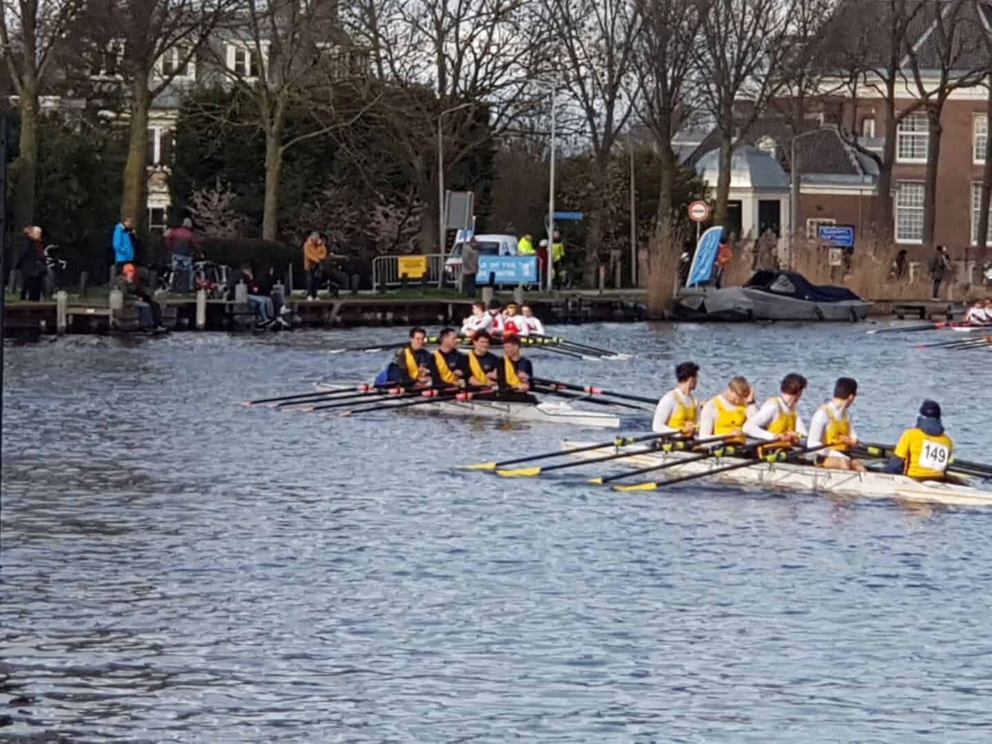 Na een dag van sneeuwstormen en ijzige wind is het weer zaterdagochtend verassend goed. De Amstel ligt er rustig bij, klaar voor een van de grootste roeievenementen in Nederland: de Head of the River Amstel. De achtervolgingsrace van ongeveer acht kilometer begint bij Oudekerk aan de Amstel. Hier slingert de wedstrijd door een oer-Hollands landschap van weilanden en riet, waarna de roeiers onder de Rozenoordbrug door Amsterdam binnen varen. De finish is voor roeivereniging De Hoop. Namens Iris starten we in een gladde vier met roeiers Martijn Heurter (boeg), Wesley van Wijngaarden, Arthur Oosterman, Guus Heemskerk (slag) en stuur Vera de Jong. In totaal doen er dertien heren club-vieren mee, waaronder drie Duitse ploegen.