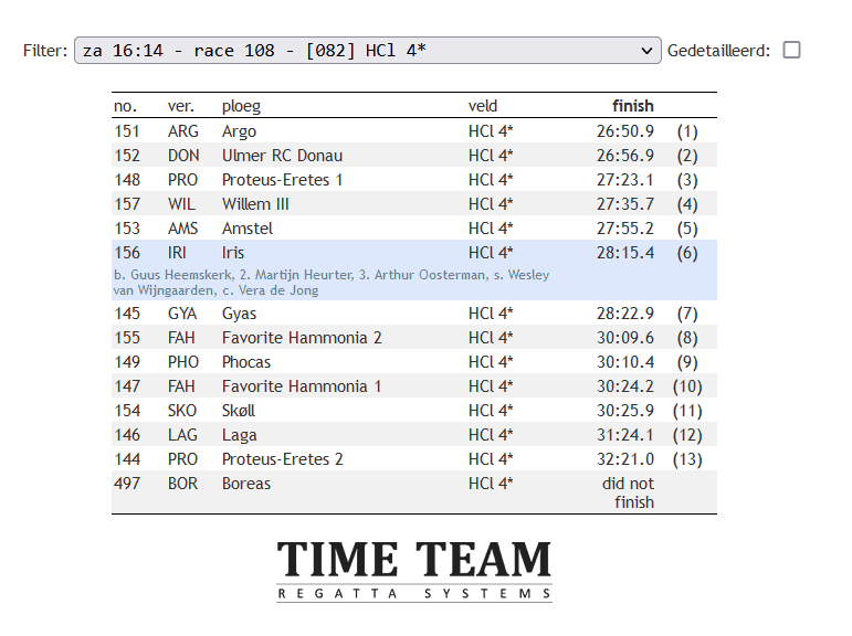 Omdat het de eerste keer is dat er een vier van Iris in dit veld meedoet, zijn de verwachtingen niet al te hoog en moet er als een-na-laatste worden gestart. Vrijwel direct na de start wordt de Iris vier eruit gesprint door de oplopende ploeg van Willem III, de organiserende vereniging. Ondanks deze tegenvaller worden de halen na verloop van tijd steeds gelijker. En onder corrigerend en motiverend geschreeuw van coach Erik gaat de boot steeds beter lopen. Langzaam maar zeker nadert Iris een van de Duitse ploegen die voor hen vaart. In een scherpe bocht in de Amstel weet stuur Vera de boot precies binnendoor te sturen, en na de bocht schiet de Iris vier zijn voorganger voorbij. Ondertussen blijft de snelheid oplopen en de volgende concurrent is in zicht. En weer weet de stuur strak binnenlangs te sturen in een van de kronkels van de Amstel. Dan rest er nog ongeveer twee kilometer van de in totaal 7,5 km lange race, met als enige doel de Willem III ploeg in te halen. Na elke bocht en brug loopt Iris verder in op de concurrerende vier. En hoewel het tempo tot aan de finish in Amsterdam hoger heeft gelegen, was het net te weinig om de concurrenten in te halen. Uiteindelijk is er als zesde van de dertien ploegen gefinisht, met een tijd van net boven de 28 minuten.