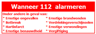 Bel bij spoed direct 112 of de huisartsen(spoed)post of één van de andere telefoon nummers vermeld op de rode “Ongevallenkaart” . Deze vind je beneden bij de ingang en boven naast de keukendeur.